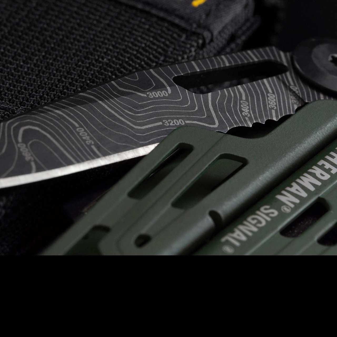 A perfect fit for any adventure, the Leatherman Signal combines 19 useful tools into a compact, 4.5 inch size. This multi-tool readies you for the unexpected with its fire-starting ferro rod, 420HC combo blade, and emergency whistle. Tighten gear with the customizable bit driver and anchor your tent stakes with the built-in hammer. A topographical map design is laser-etched into the knife blade. Gear up and go further with the Leatherman Topo Signal. Nylon sheath included.