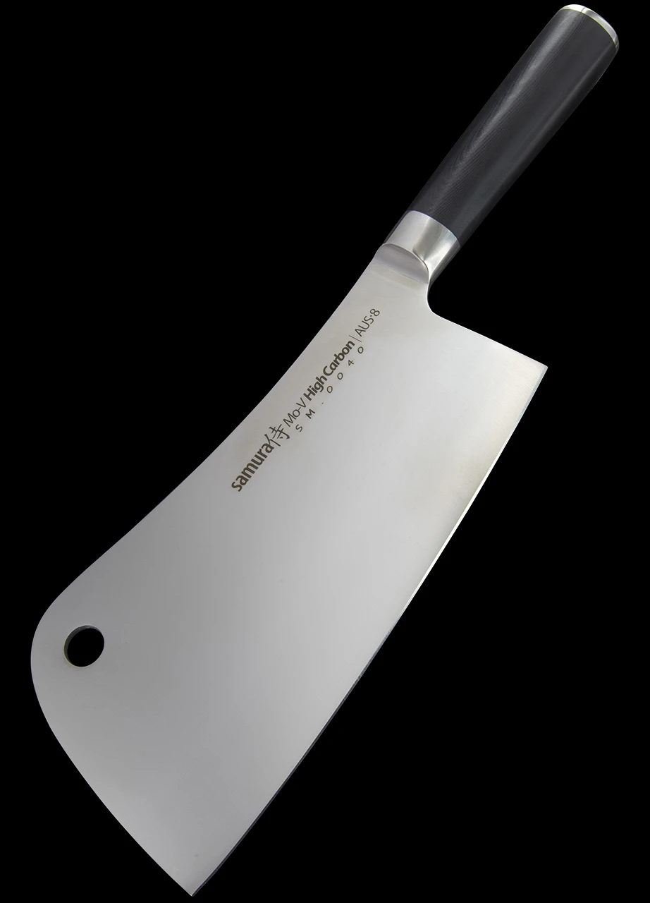 The Samura MO-V Cleaver is a professional-grade piece of equipment With its one-piece blade having a very narrow profile, this knife is specially designed for fish, poultry, veal or lamb and is able to easily separate the loin from bones and skin.